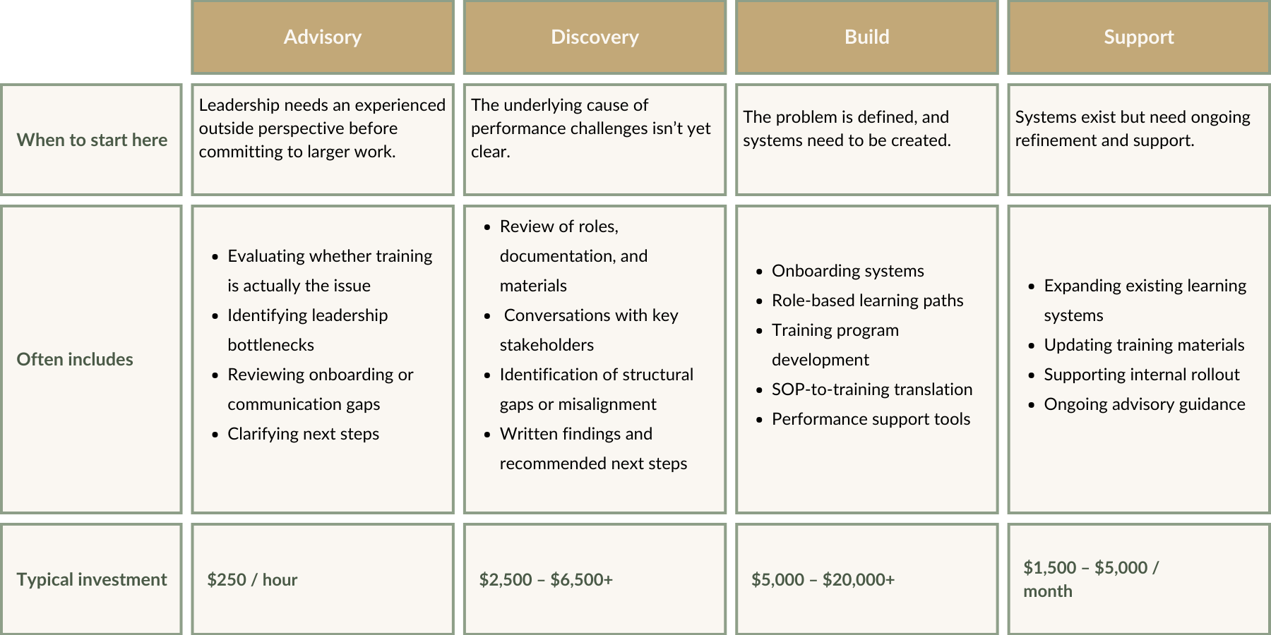 Most organizations begin by clarifying the problem before building new training or systems. Work typically moves through the stages below, depending on what the situation requires.