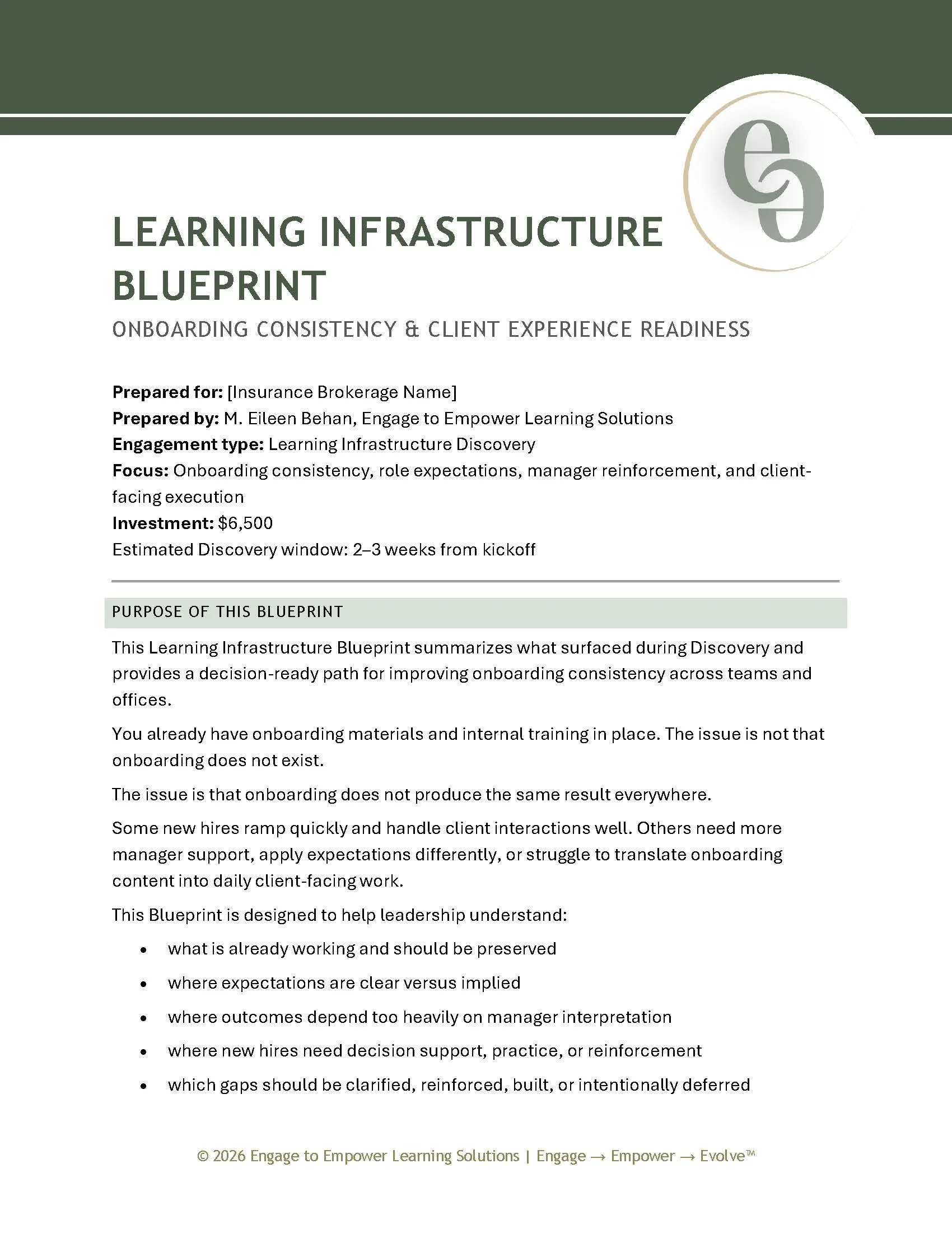 This included a diagnostic review of existing materials and onboarding structure, identification of where expectations were unclear or inconsistently applied, and a decision-ready blueprint for next steps.
