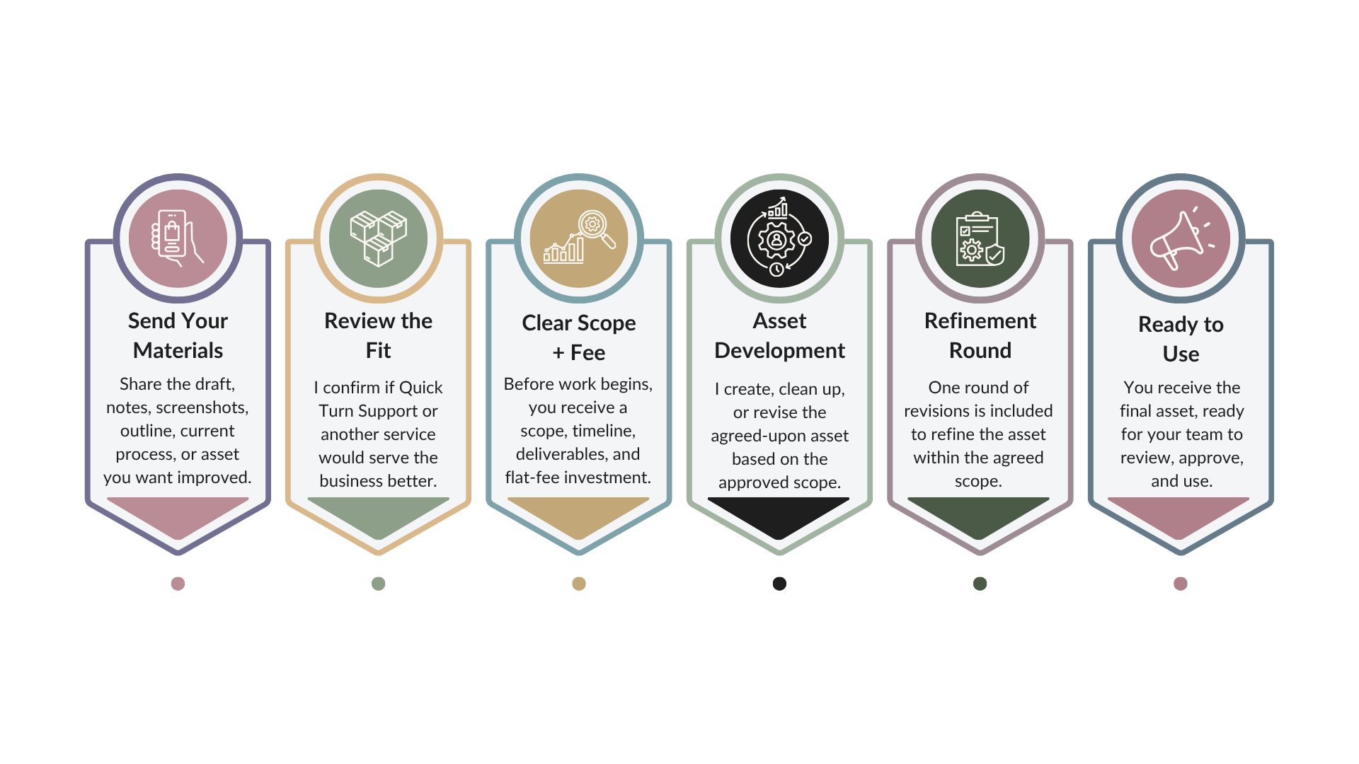 Quick Turn Support is designed for clearly defined, contained work. It does not include legal, HR, compliance, operational management, or guaranteed business outcomes. Clients remain responsible for review, approval, implementation, publication, and use of final materials.